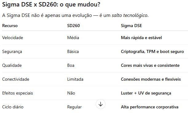 A Entrust projetou a Sigma DSE para ser uma impressora mais moderna, eficiente e preparada para demandas corporativas, substituindo a linha SD com melhorias significativas.